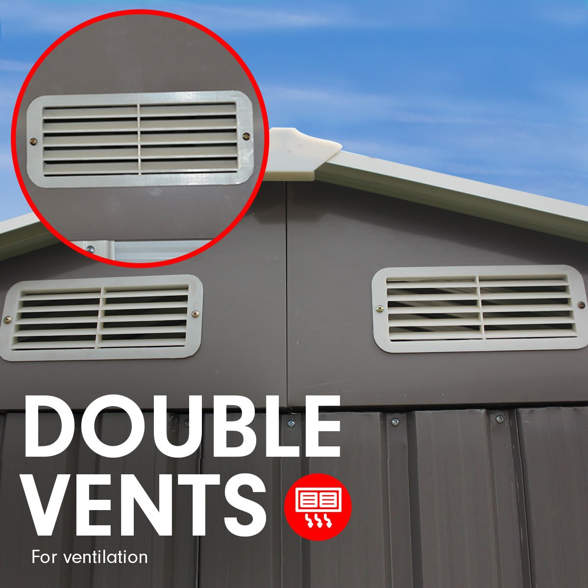 The spire roof design keeps rainwater flowing off, while dual vents ensure airflow and natural light inside. Access is a breeze thanks to double sliding doors that glide open with ease.
