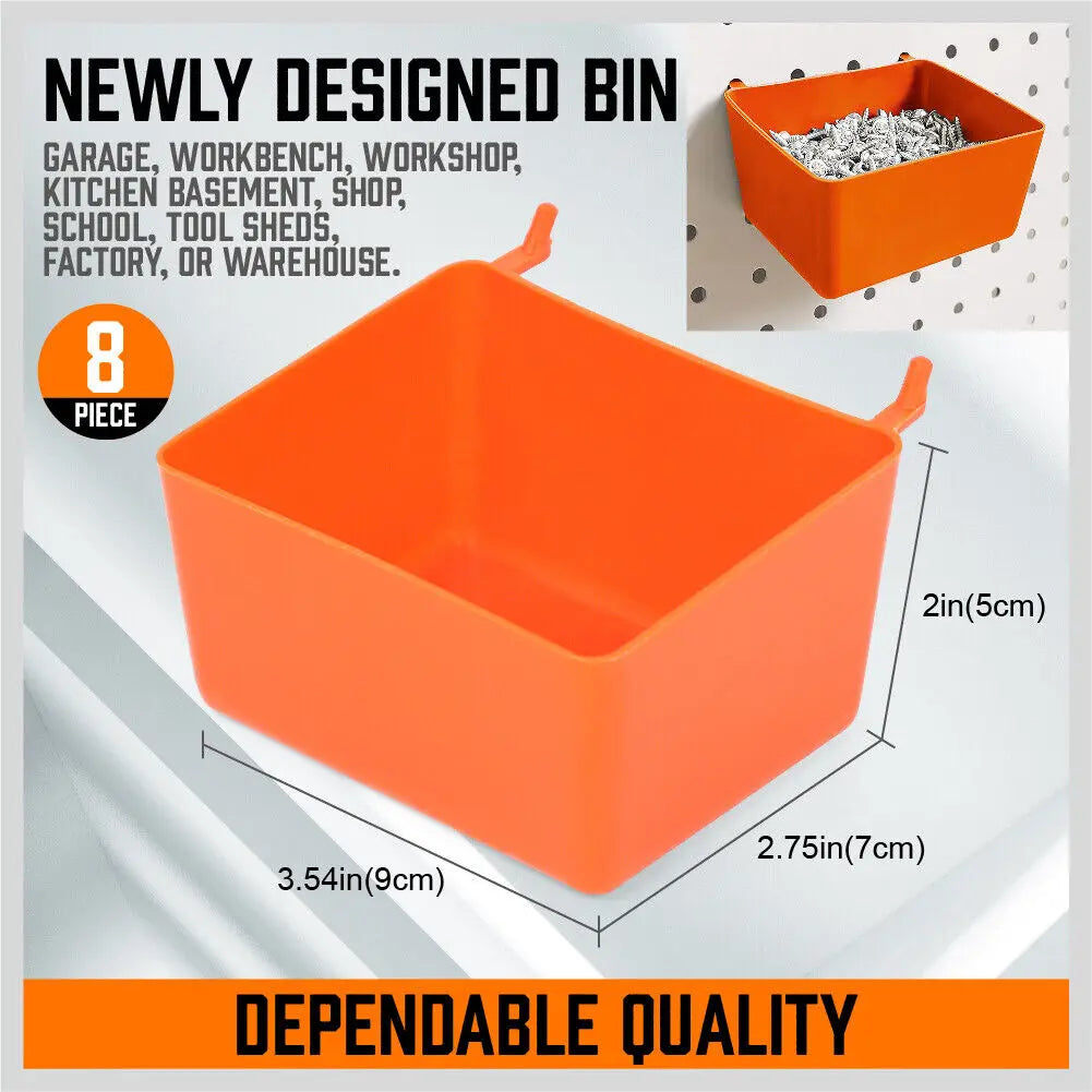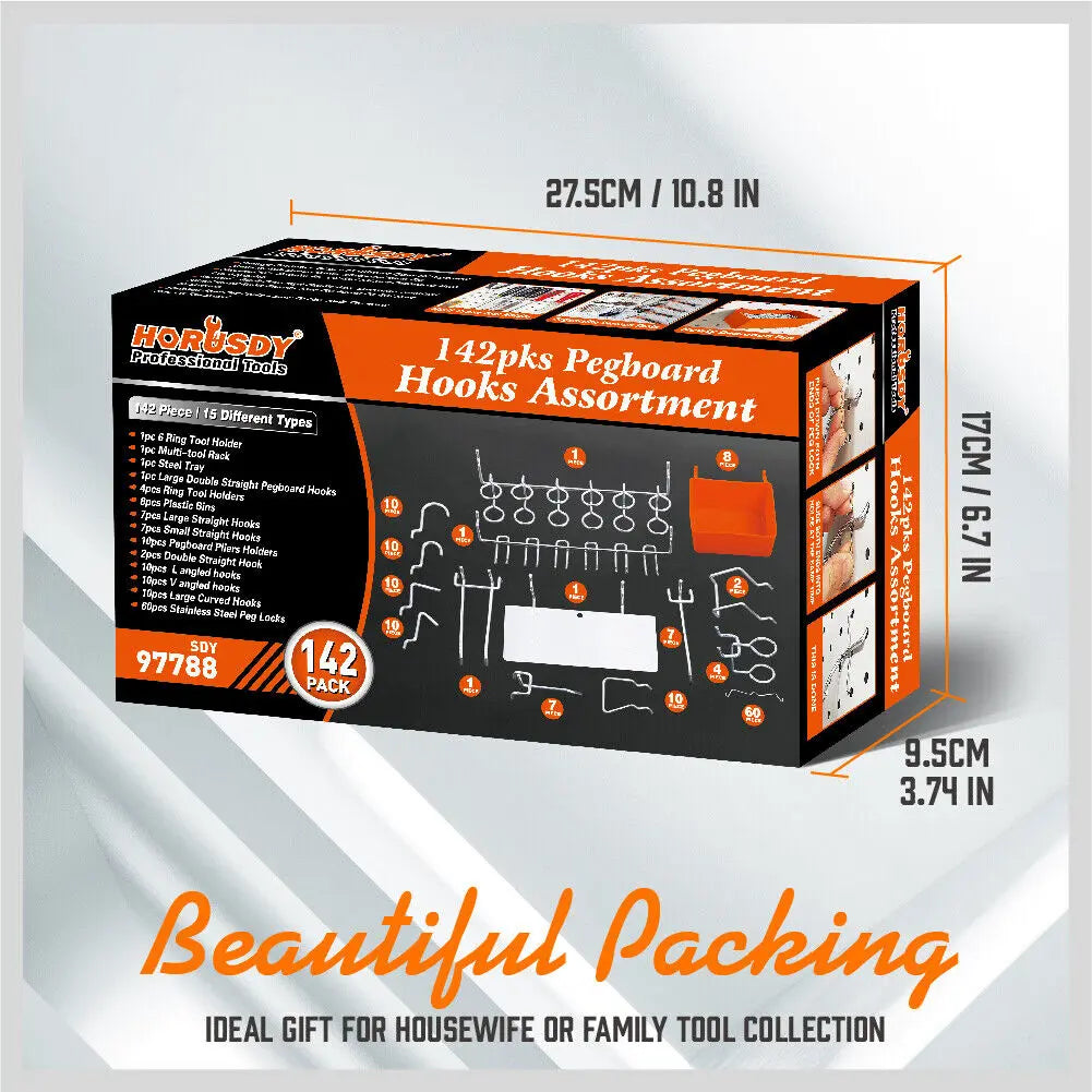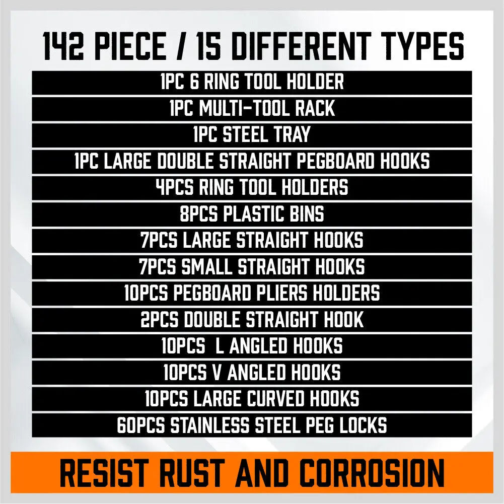 - 142 pieces total: 71 hooks in 10 different styles, 8 storage bins, tool holders, trays, and 60 peg locks to keep everything secure