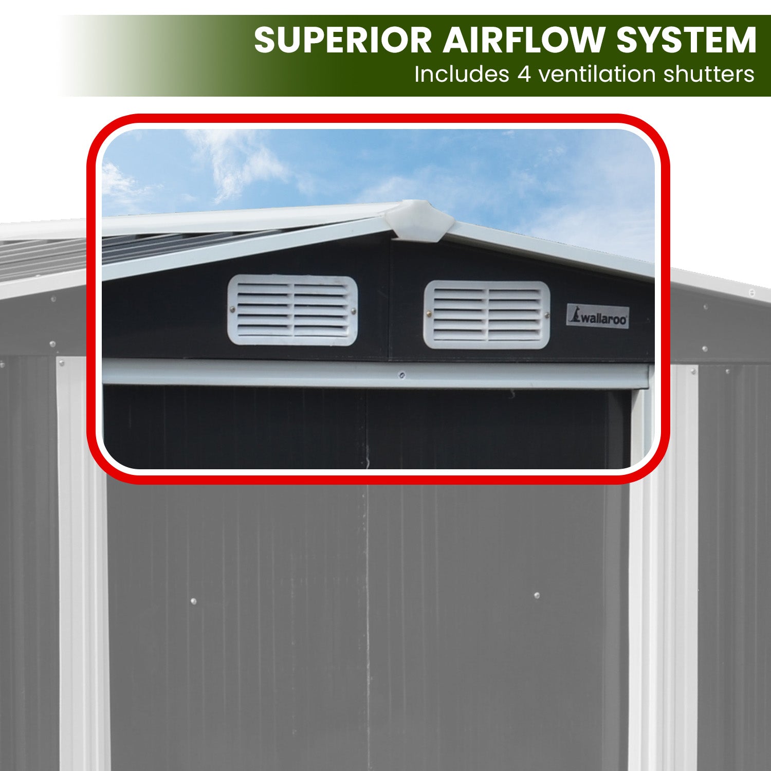 Built from heavy-duty 23-gauge zinc-coated steel, this shed laughs at Australian weather conditions—sun, rain, wind, and UV rays. The extra-wide sliding double doors provide easy access even when carrying bulky items, while the four integrated vents maintain airflow to keep your gear dry and fresh.